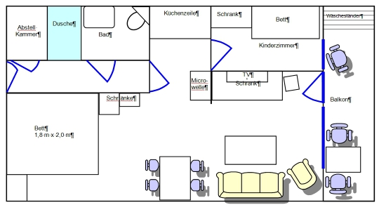 Die Wohnung befindet sich im 1. OG (Aufzug ist vorhanden). Sie besteht aus einem Wohn-Schlafraum, 1 sep. Schlafraum mit Etagenbett, WC mit großer Dusche, Abstellkammer und Balkon. Vom Balkon haben Sie einen seitlichen Blick auf die Ostsee. Im Sommer können Sie auf dem Balkon die Sonne von mittags bis abends genießen.